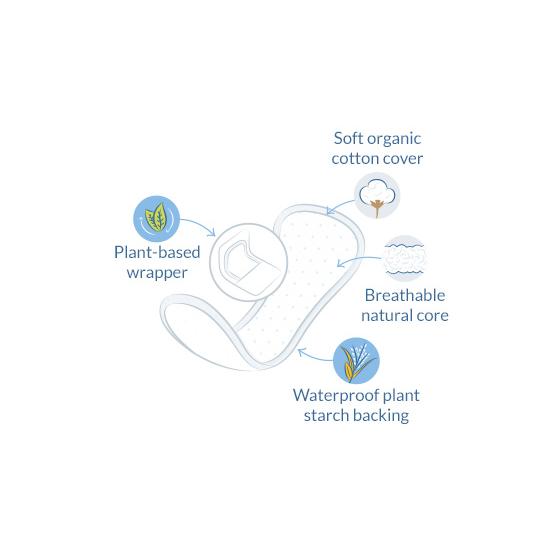 Ingredientes: Algodón orgánico certificado, pulpa de celulosa ecológicamente certificada, almidón de maíz sin OGM, adhesivo inocuo para la salud