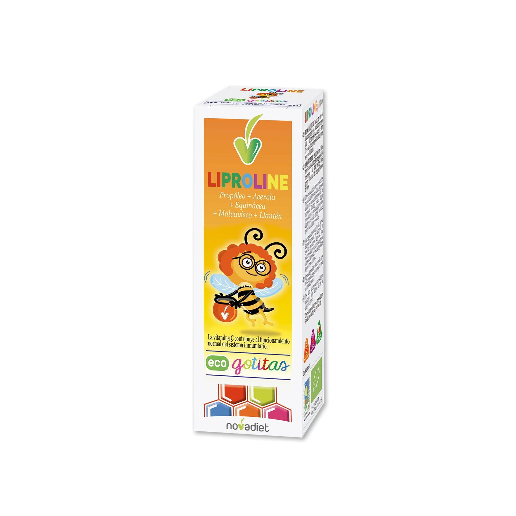 El Liproline Eco Gotitas de Novadiet es un complemento alimenticio natural y ecológico diseñado para reforzar las defensas del sistema inmunológico en niños a partir de 1 año. Su fórmula combina propóleo con plantas como equinácea, malvavisco y llantén, junto con vitamina C proveniente de la acerola, para aliviar los síntomas de resfriados y gripe, y reducir las molestias de garganta y tos.
