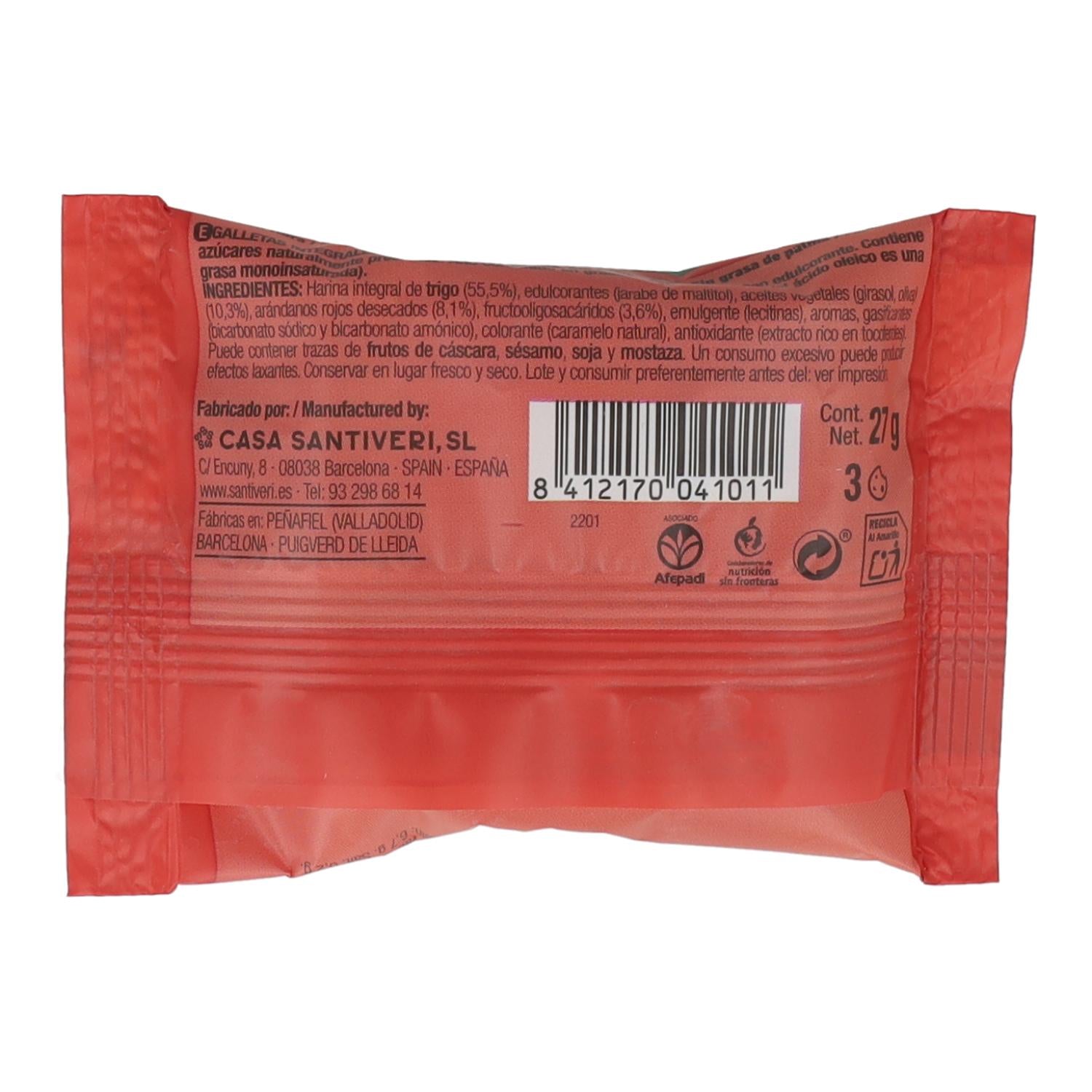 Harina integral de trigo 55,5%, edulcorantes (maltitol), grasas vegetales (girasol y oliva) 10,3%, arándanos rojos desecados 8,1%, fructooligosacáridos 3,6%, emulgente: lecitina de girasol, aromas, gasificantes: bicarbonato sódico y bicarbonato amónico, colorante: caramelo, antioxidante (extracto rico en tocoferoles), ácido fólico (ácido pteroilmonoglutámico).