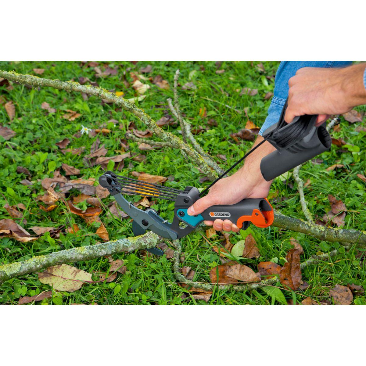 Corta ramas altas desde el suelo - madera fresca La Tijera de pértiga Combisystem de GARDENA es perfecta para cortar nuevas ramas en lugares altos y con menos esfuerzo gracias a que se consigue 5 veces la transmisión de la fuerza. Junto con un mango telescópico combisystem de GARDENA, es muy sencillo cortar las ramas desde el suelo sin necesidad de escaleras. El sistema de bloqueo garantiza que la conexión se mantenga fija. Garantiza un corte sin esfuerzo de ramas de hasta 35 mm de diámetro. El resvestimiento antiadherente de la cuchilla asegura un corte limpio y preciso, asi como una fácil limpieza. Incluye empuñadura en forma de D para garantizar un trabajo más fácil y eficiente. La longitud de la cuerda es de 4,7 m, anti- roturas y fácil de manejar. También puede usarse sin el mango. 25 años de garantía. Especificaciones Tipo de corte: Bypass