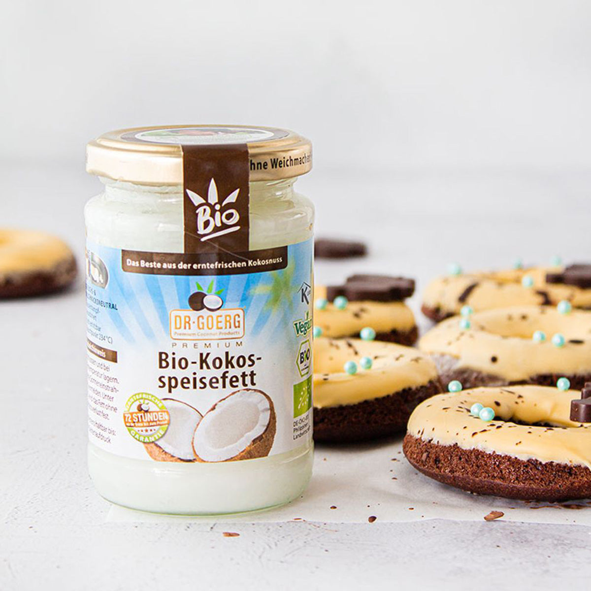 El aceite de coco para cocinar bio premium Dr. Goerg tiene un periodo de conservación de hasta dos años. El aceite bio debe almacenarse cerrado, a temperatura ambiente y fuera del alcance de la luz solar directa. A una temperatura inferior a 24 °C se solidifica sin que por eso se reduzca la calidad.
