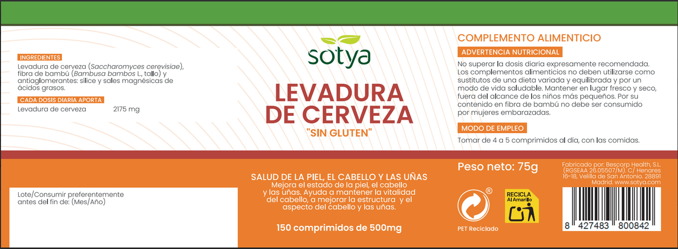 La levadura de cerveza contribuye a mantener la vitalidad del cabello, a mejorar la estructura y el aspecto del cabello y las uñas. Ayuda en caso de uñas frágiles.. Nuestra fórmula además, es libre de gluten. Dosis para 30 días.