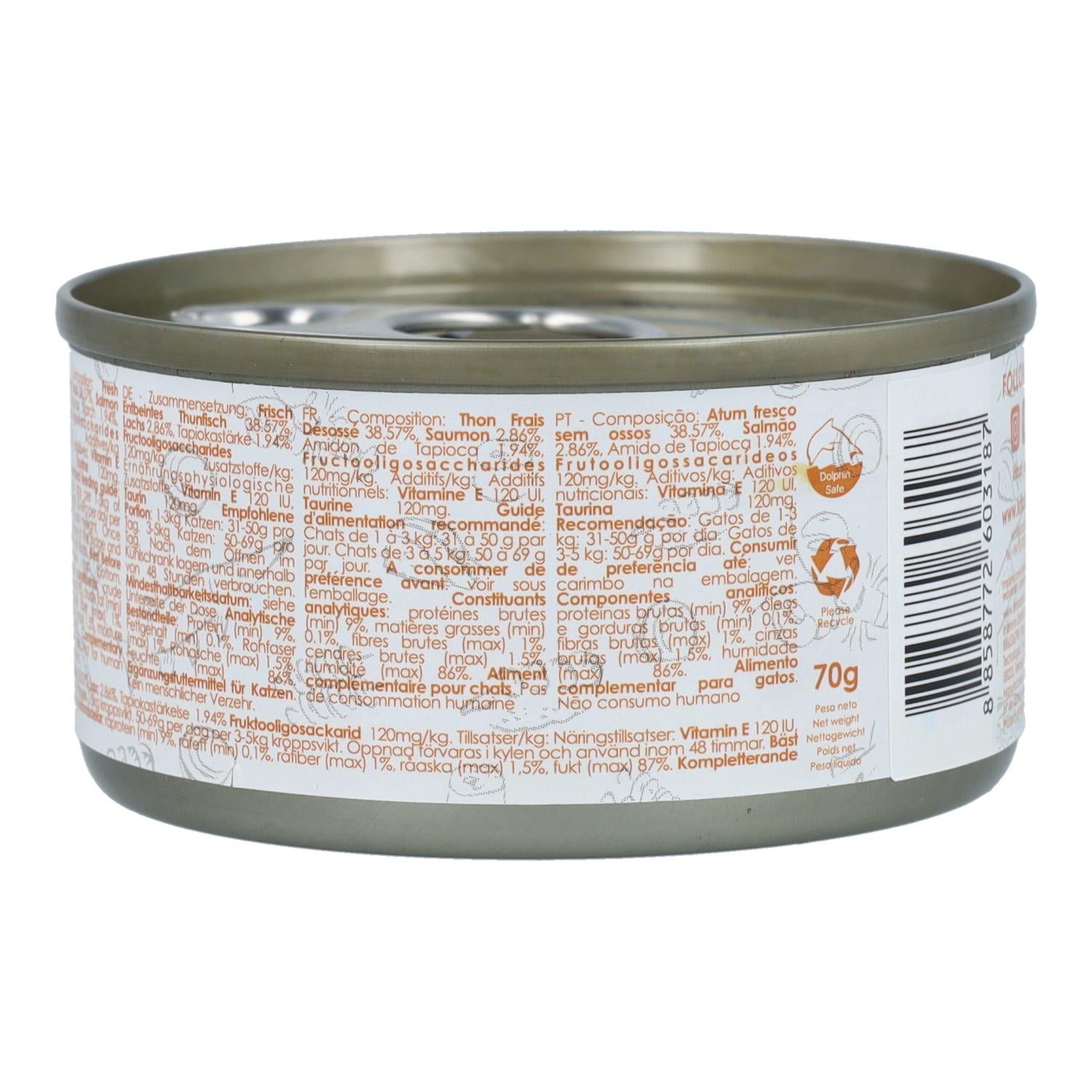 Lata de comida húmeda en salsa complementaria para gatos de atún con salmón. Sin cereales, sin gluten y sin subproductos. Receta elaborada con las mejores materias primas y con los nutrientes esenciales para que tu gato tenga una alimentación de calidad para su óptimo desarrollo.