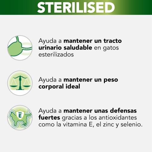 PURINA® PRO PLAN® Sterilised tiernos trozos con buey en salsa es un alimento completo para gatos esterilizados/Características y beneficios/Ayuda a mantener un tracto urinario saludable en gatos esterilizados. Ayuda a mantener un peso corporal ideal. Ayuda a mantener unas defensas fuertes gracias a los antioxidantes como la vitamina E,el zinc y selenio.