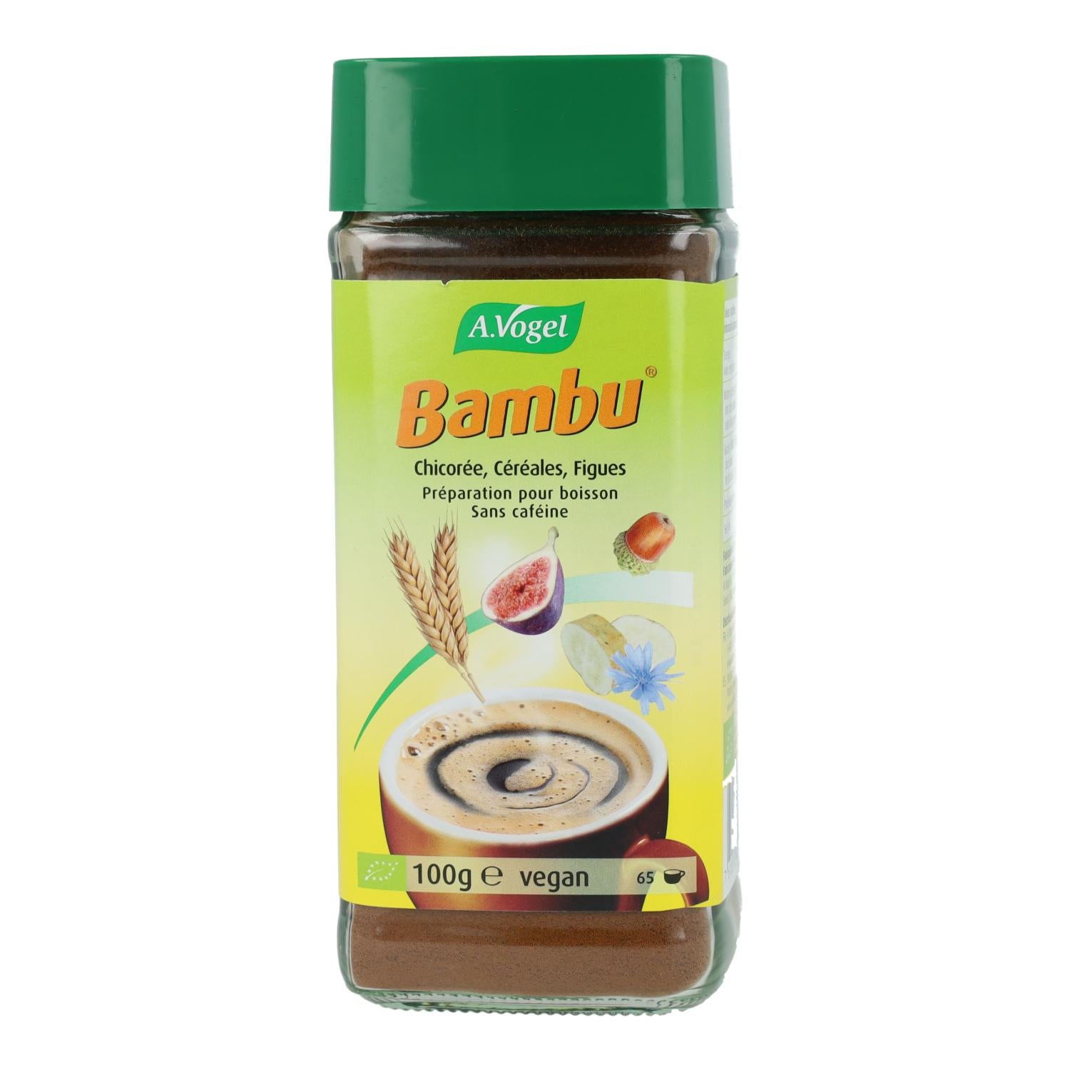 El Bambú instantáneo A.Vogel es una bebida soluble 100% natural a base de cereales, frutos y achicoria de cultivo biológico. Posée un aroma y sabor inigualable, similar a los mejores cafés tostados del mundo. No altera el sueño ya que no contiene cafeína. Puede ser tomado a cualquier hora, sólo o con leche y hará las delicias de un buen desayuno. También pueden tomarlo los niños. Es instantáneo y puede disolverse también en leche fría (de soja, avena, arroz). Ideal para una bebida de verano.