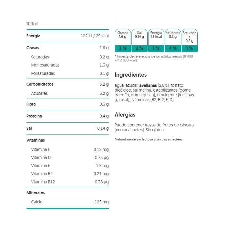 Ingredientes: agua, azúcar, avellanas (2,8%), fosfato tricálcico, sal marina, estabilizantes (goma garrofín, goma gellan), emulgente (lecitinas (girasol)), vitaminas (B2, B12, E, D2). Puede contener trazas de frutos de cáscara (no cacahuetes).