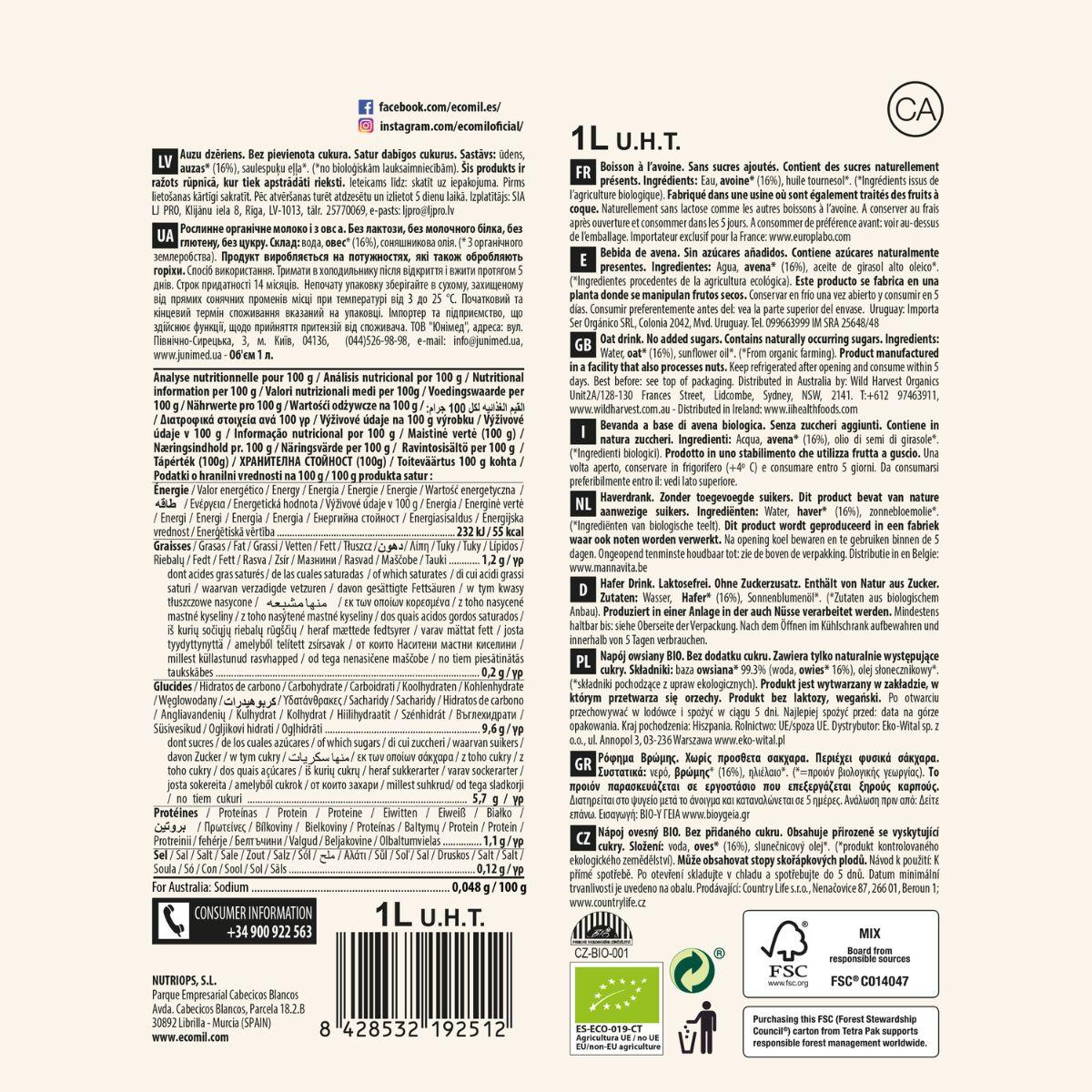 All information om "Vegetabilisk dryck av ekologisk havre utan tillsatt socker Ecomil 1 l"