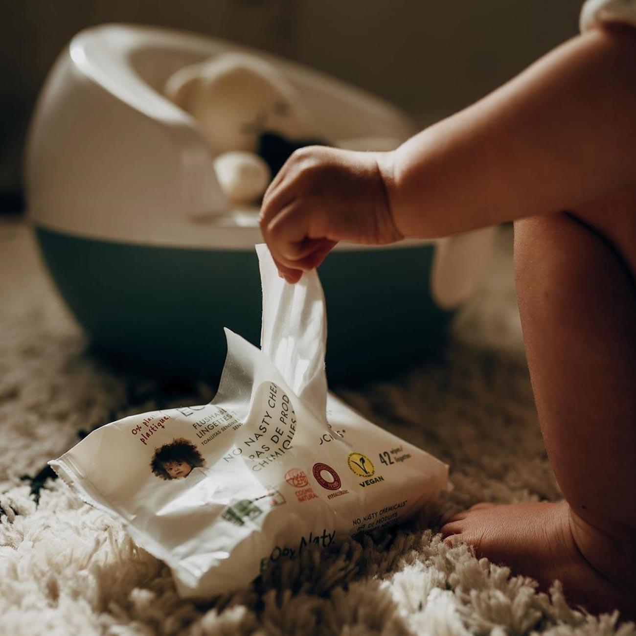 Envase con cierre adhesivo que contiene 56 toallitas.